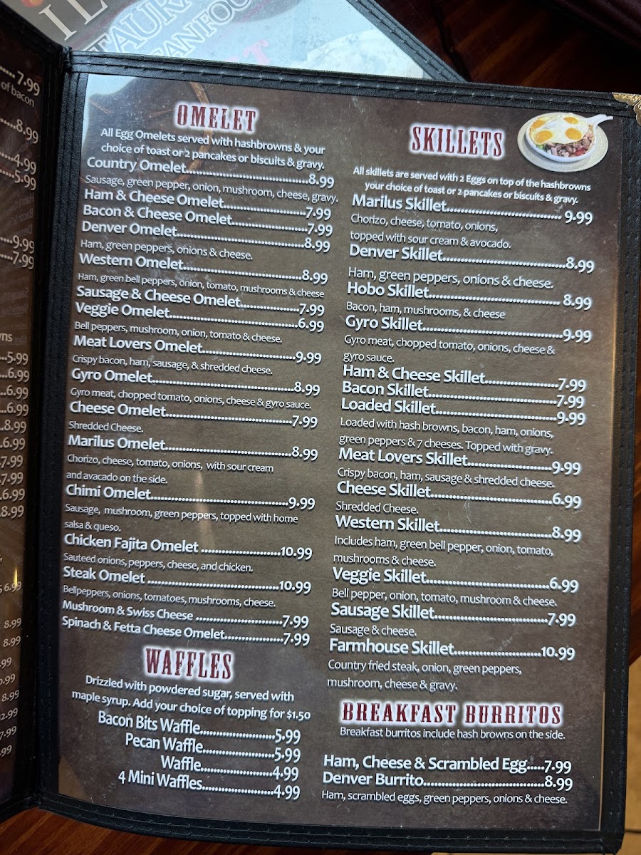 1 egg, ham, 2 sausage links or 2 strips of bacon, hash brown & your choice of toast, pancakes, or biscuits & gravy.